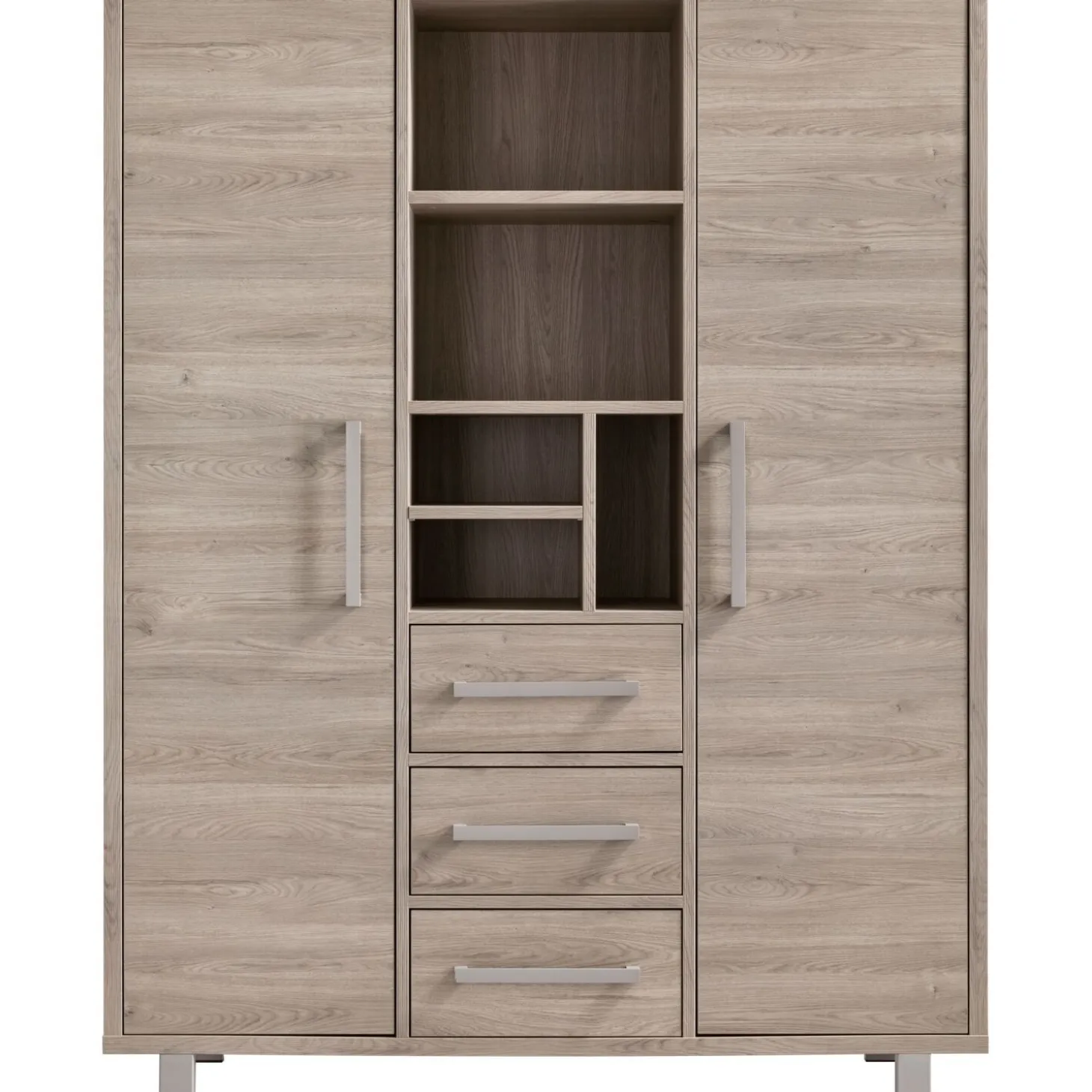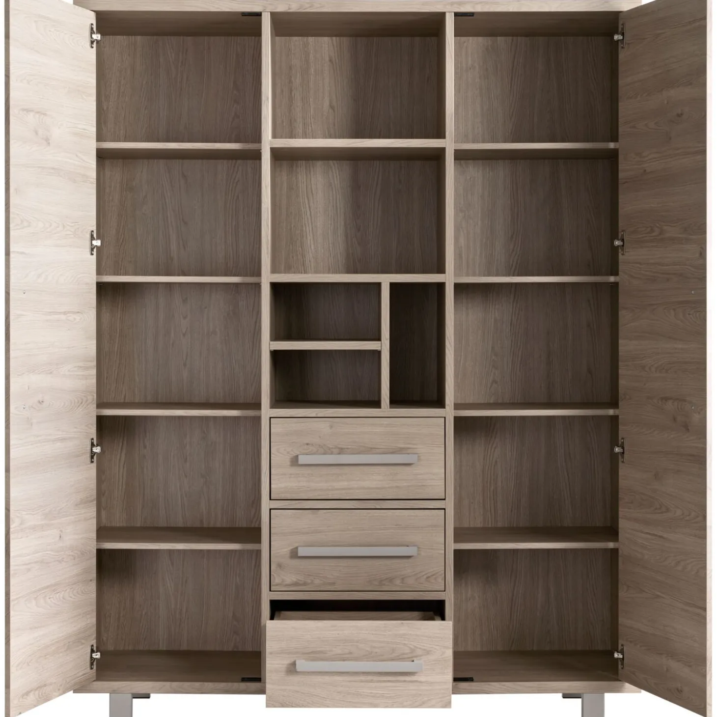 | Uitvoering | Uitgevoerd in de kleur grey oak met metalen handgrepen en poten in de kleur stone grey, met 2 deuren, 3 laden en 5 open vakken. |