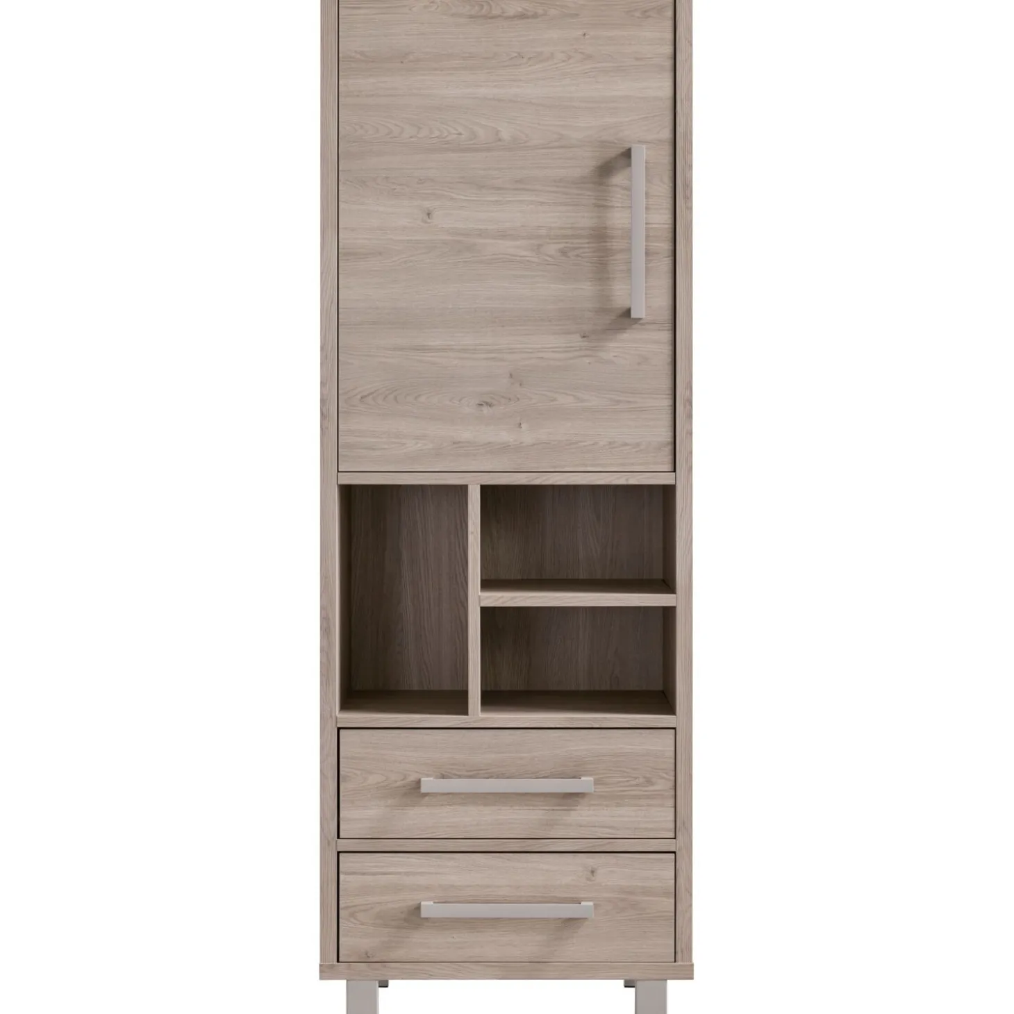 | Uitvoering | Uitgevoerd in de kleur grey oak met metalen handgrepen en poten in de kleur stone grey, met 1 deur, 2 laden en 3 open vakken. |