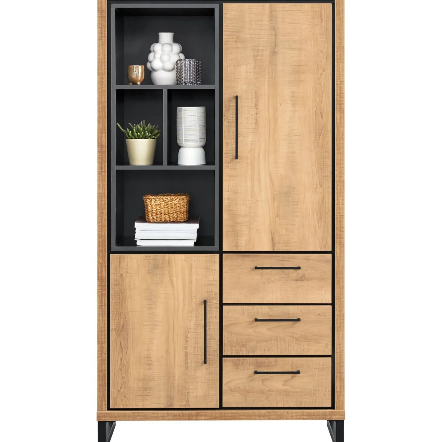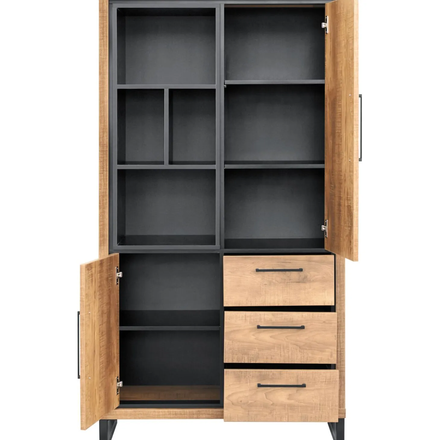 | Uitvoering | Uitgevoerd in melamine mango decor met zwart metalen frame met 2 deuren, 3 laden en 4 open vakken. |