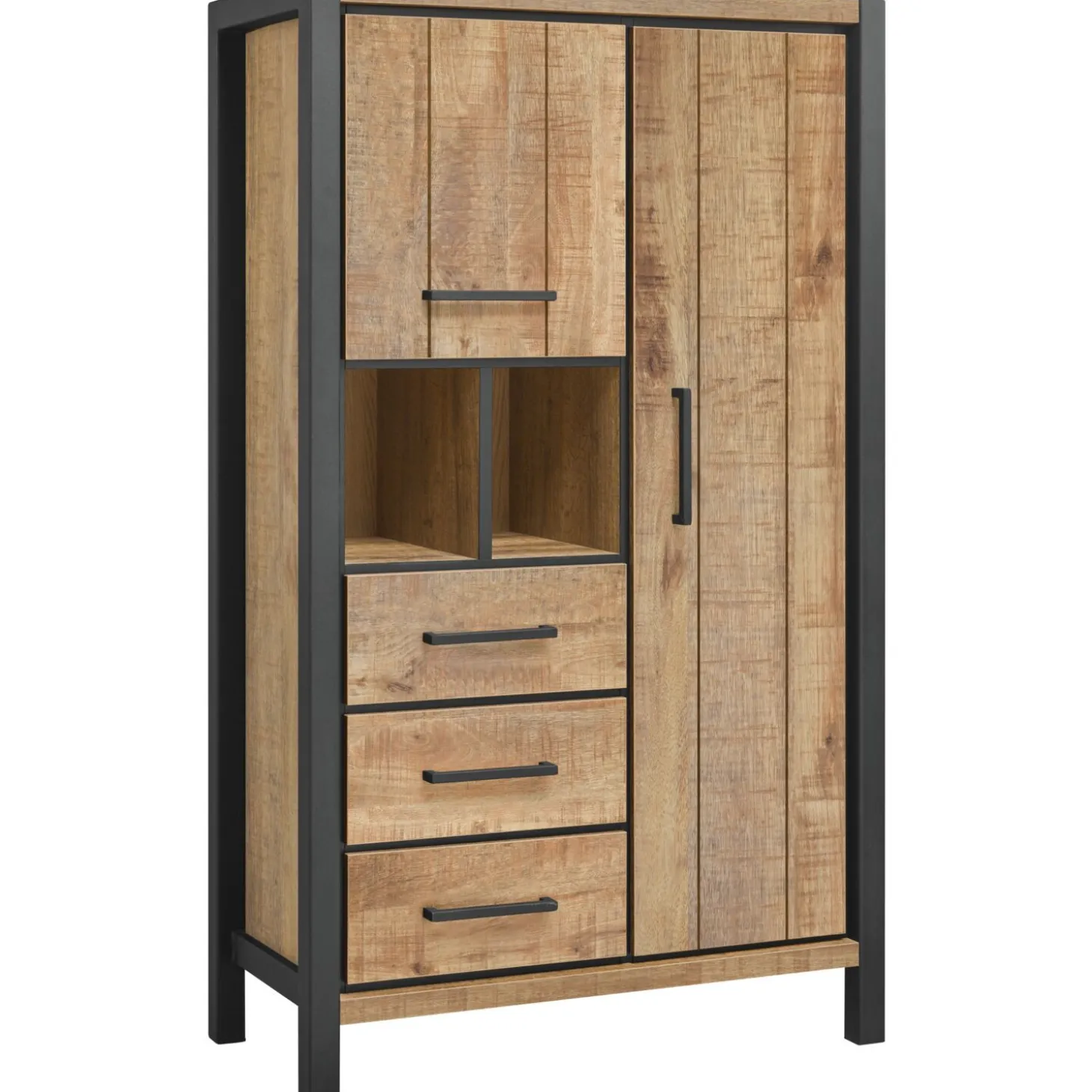 | Uitvoering | Uitgevoerd in de kleur mango met zwart metalen frame, 2 deuren, 3 laden en 2 open vakken. |