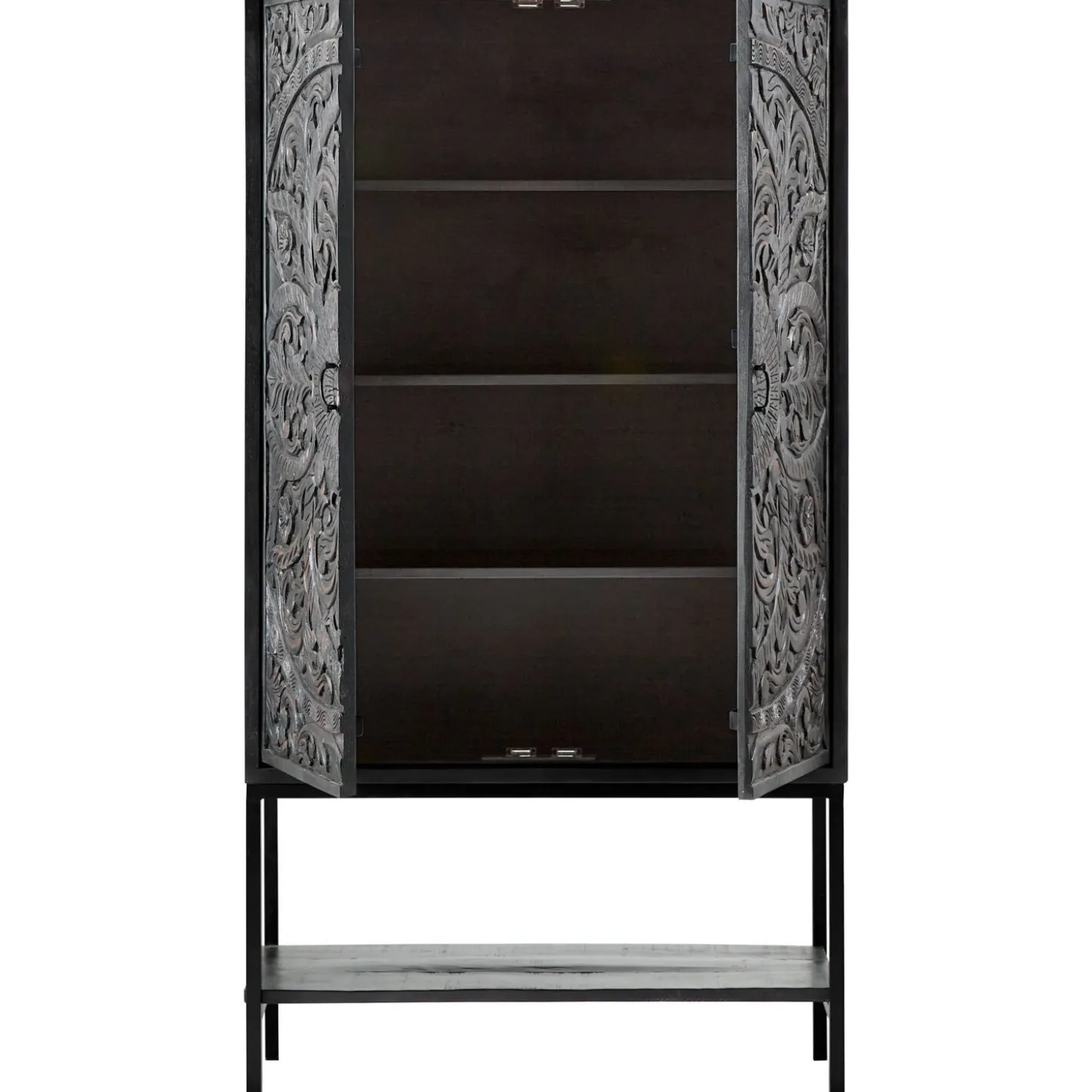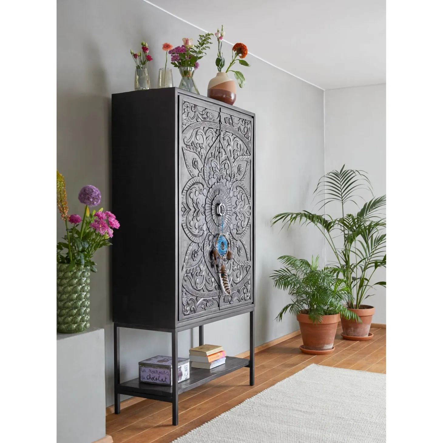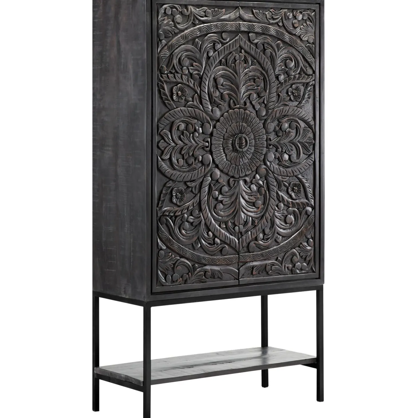 De hoge kast Montclair is gemaakt van een combinatie van mango en acacia hout in de kleur antique zwart en daarna afgelakt. Het houtsnijwerk is ambachtelijk gemaakt en dit geeft de kast een unieke uitstraling. Achter de deuren bevinden zich 3 legplanken voor extra veel opbergruimte. Naast deze kast kan je ook nog kiezen uit 2 verschillende formaten tv-meubels.