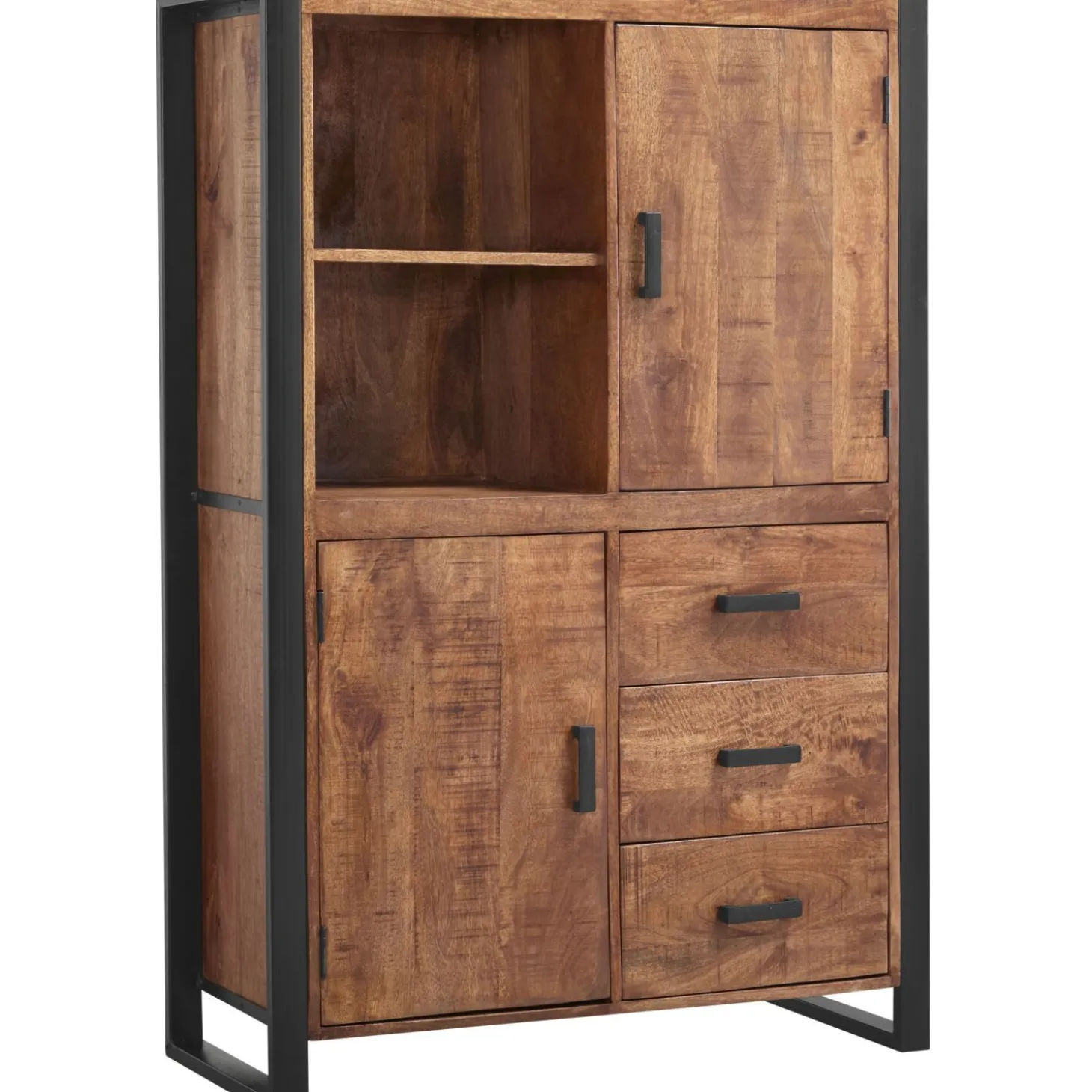 | Uitvoering | Uitgevoerd in mangohout in de kleur new weather barn met zwart metalen frame met 2 deuren, 3 laden en 2 open vakken. |