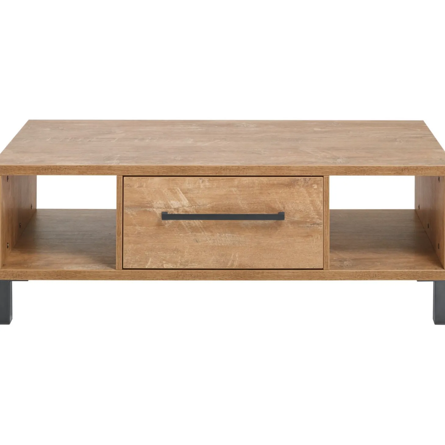 Deze salontafel heeft 1 lade met een mat zwart metalen handgreep en is voorzien van zwart metalen poten. Dit geeft een mooi contrast met de warme houtkleur.