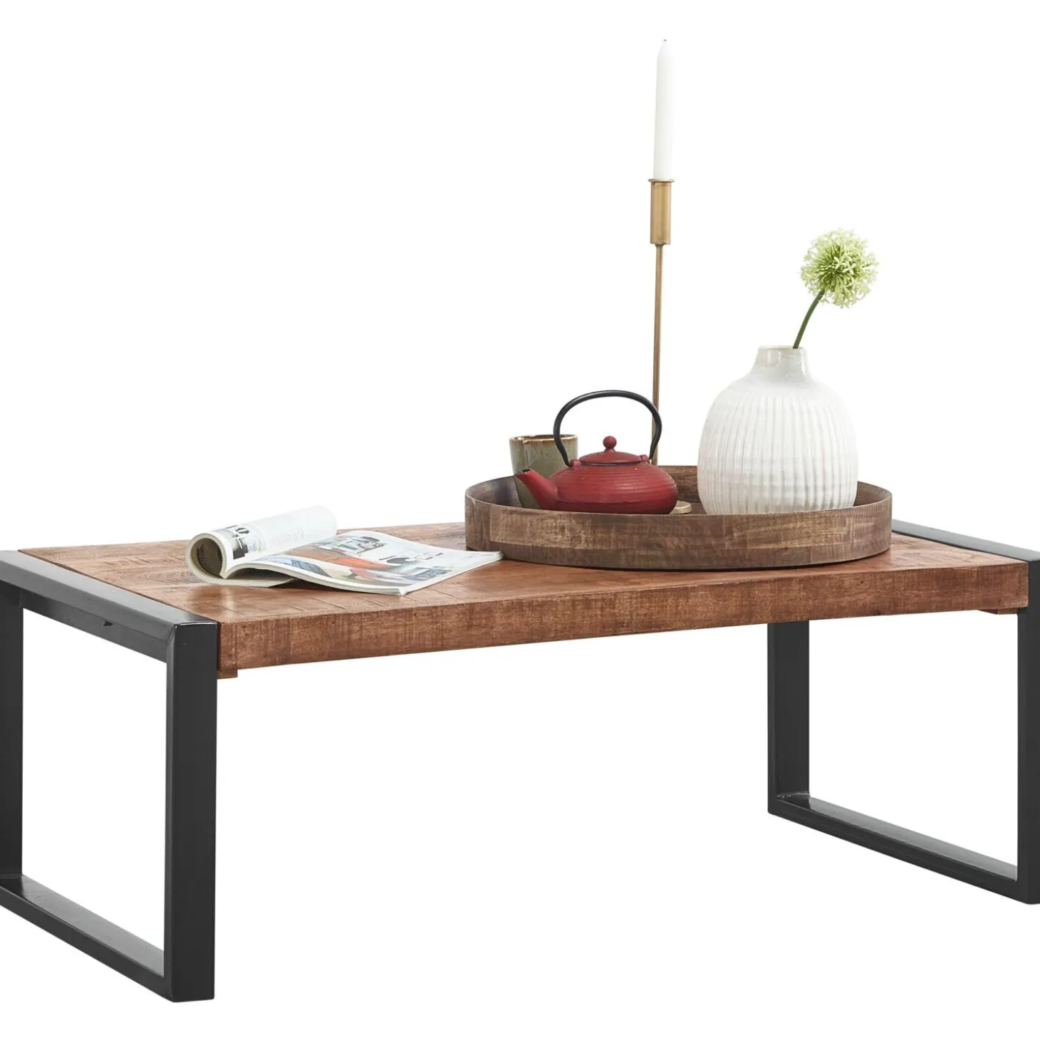 | Uitvoering | Uitgevoerd in mangohout in de kleur new weather barn met zwart metalen onderstel. |