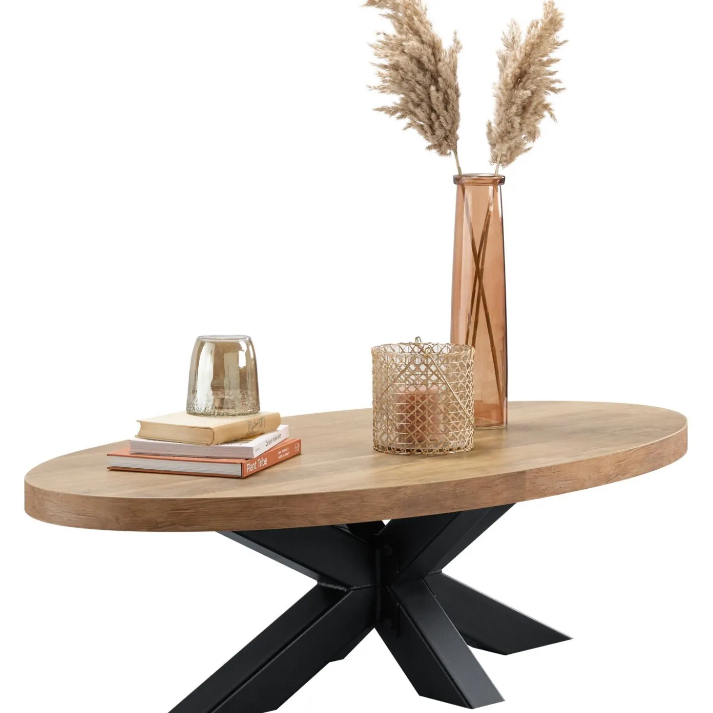 De salontafel heeft een ovale blad met een dikte van 50 mm in een warme teak kleur met een lengte van 135 cm en een breedte van 67,5 cm en is voorzien van een zwarte metalen spinpoot. De hoogte van de tafel is 37 cm. De poot van de tafel is met behulp van de handleiding eenvoudig te monteren.