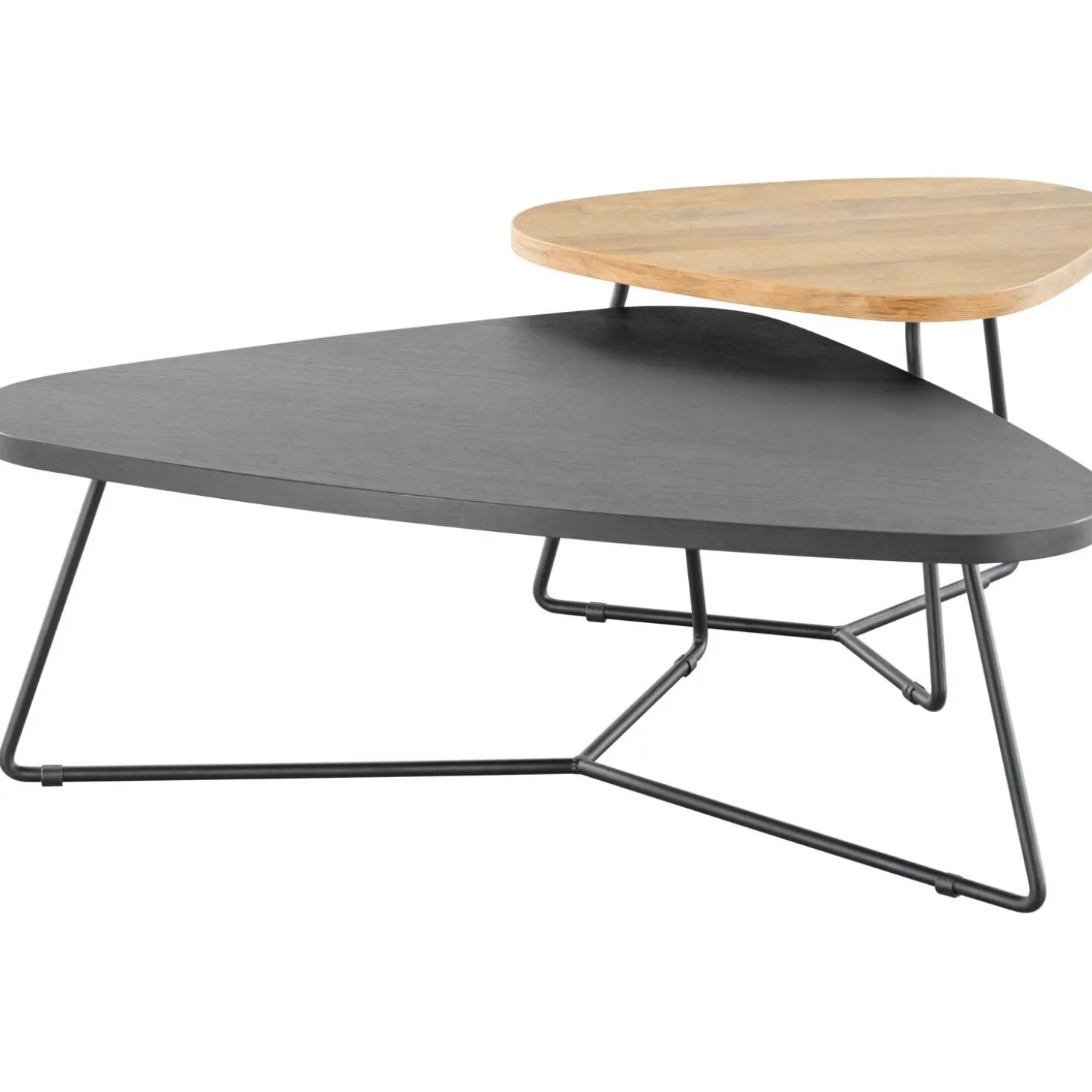 Deze bijzettafelset bestaat uit 2 tafeltjes met een druppelvormig blad. De grootste variant is uitgevoerd in een donkere kleur en heeft een afmeting van 112,4×78,5 cm en is 39 cm hoog. De kleinste variant is uitgevoerd in een warme teakkleur en is 69×58 cm groot en 46 cm hoog.