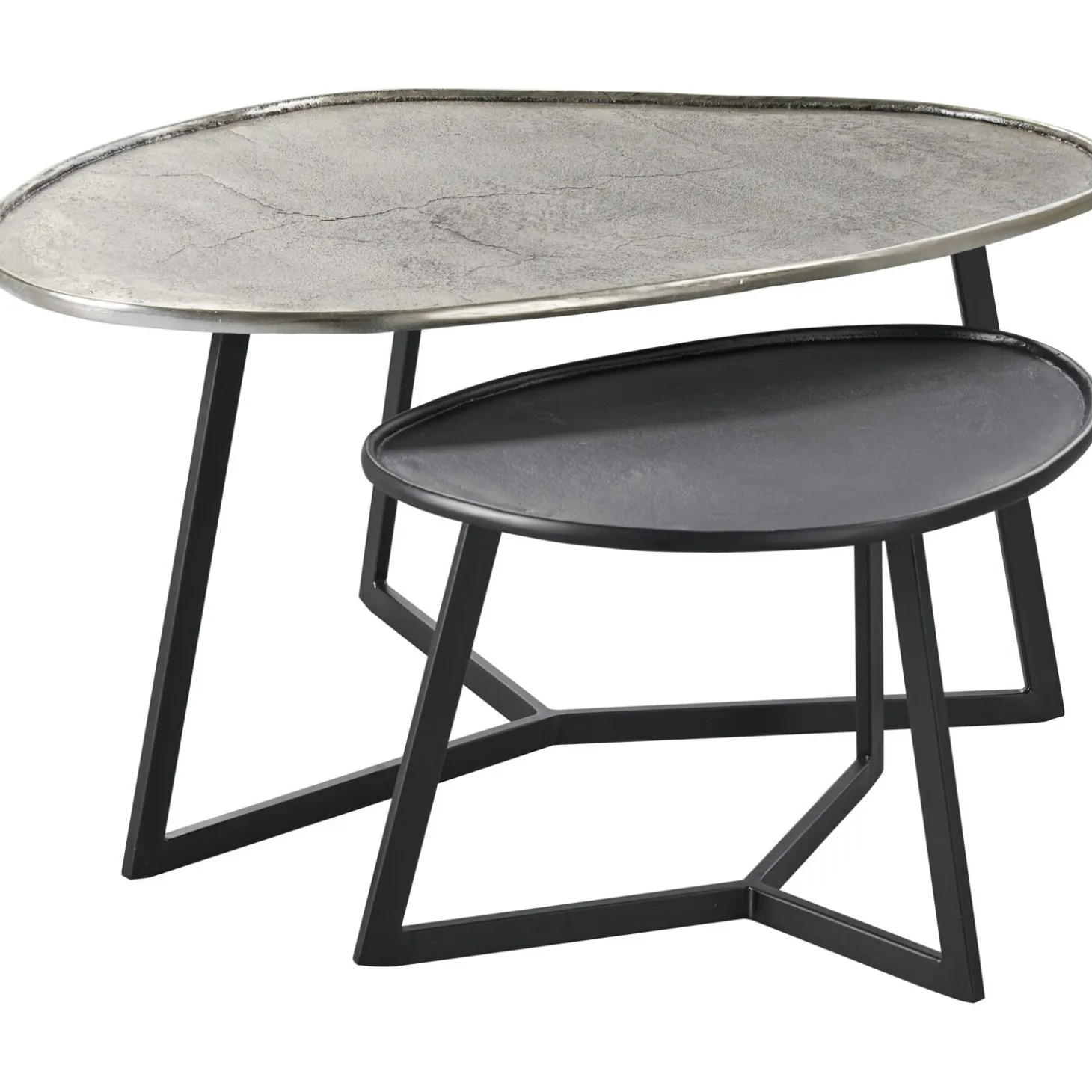 | Uitvoering | Uitgevoerd met blad in aluminium (grote tafel in zilver antiek kleur, kleine tafel in zwart) met zwart metalen onderstel. |