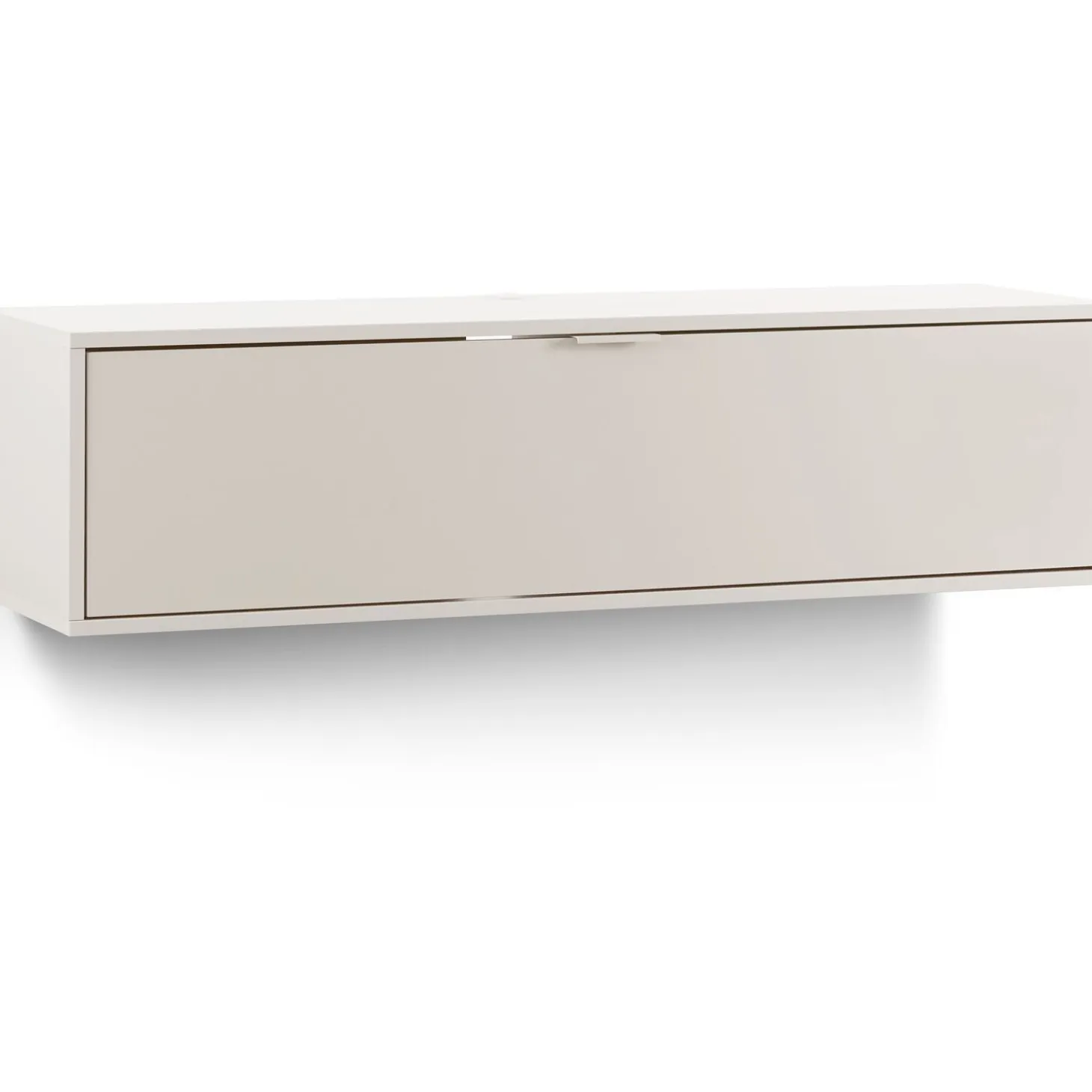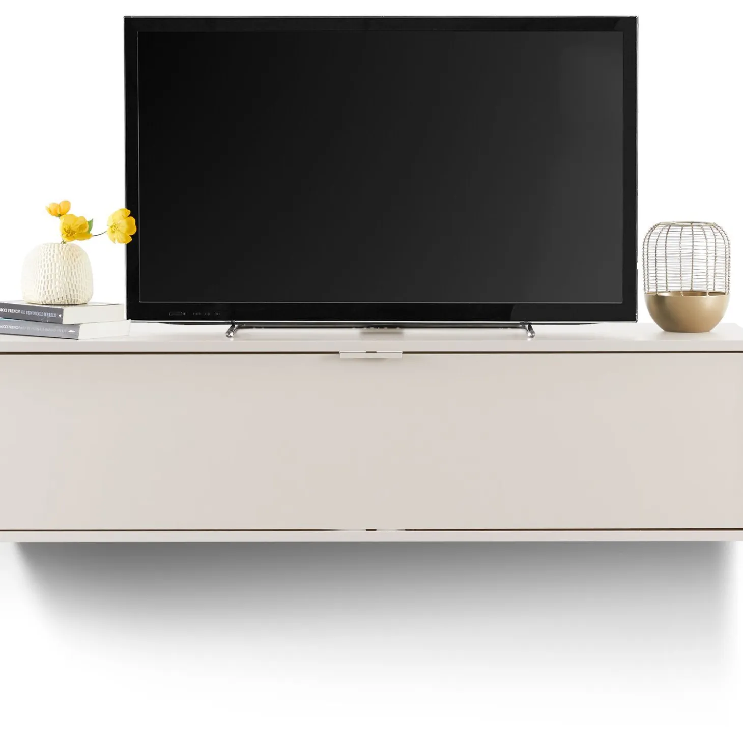 Dit TV-meubel is 140 cm breed en heeft één klep, en is daardoor perfect voor een kleinere of gemiddelde woonkamer. Er is ook een bredere variant (210 cm) met twee kleppen verkrijgbaar.