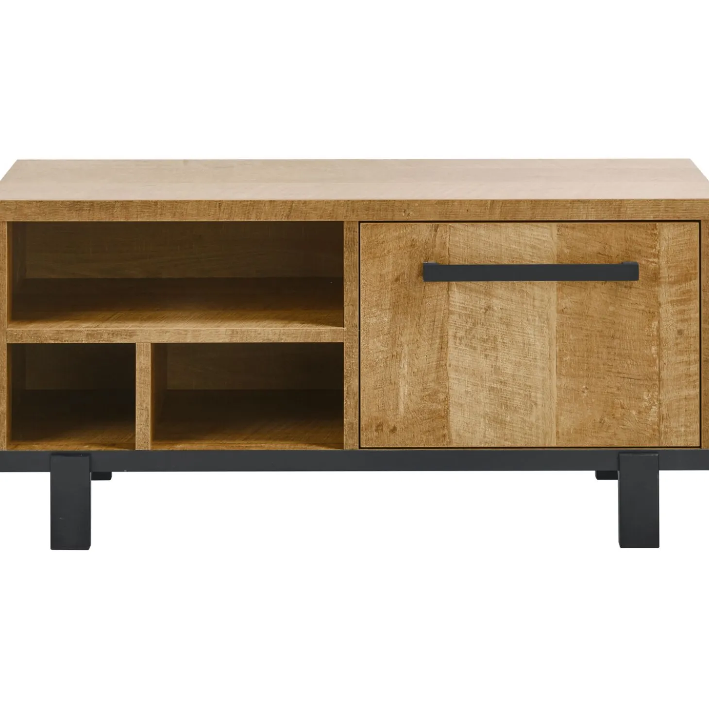 | Uitvoering | Uitgevoerd in de kleur old teak met zwart metalen frame, 1 deur en 3 open vakken. |