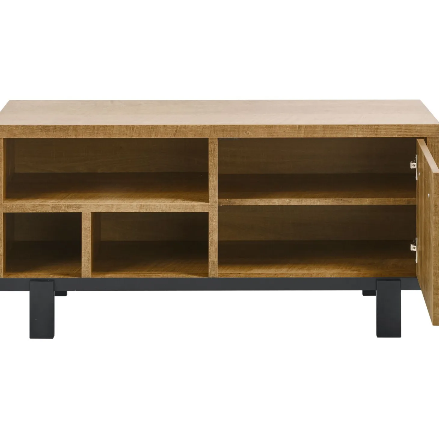 Modern tv-meubel met een strak uiterlijk. De mooie kleur old teak en het gepoedercoate zwart metalen frame geven je interieur een unieke sfeer.
