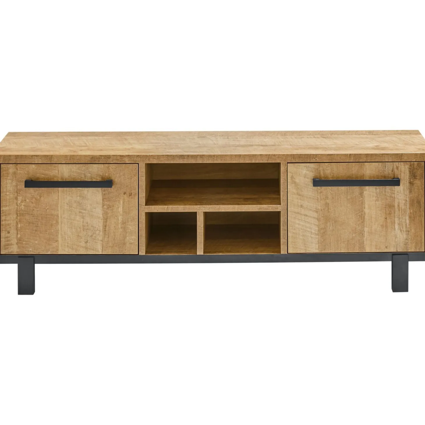 Modern tv-meubel met een strak uiterlijk. De mooie kleur old teak en het gepoedercoate zwart metalen frame geven je interieur een unieke sfeer.