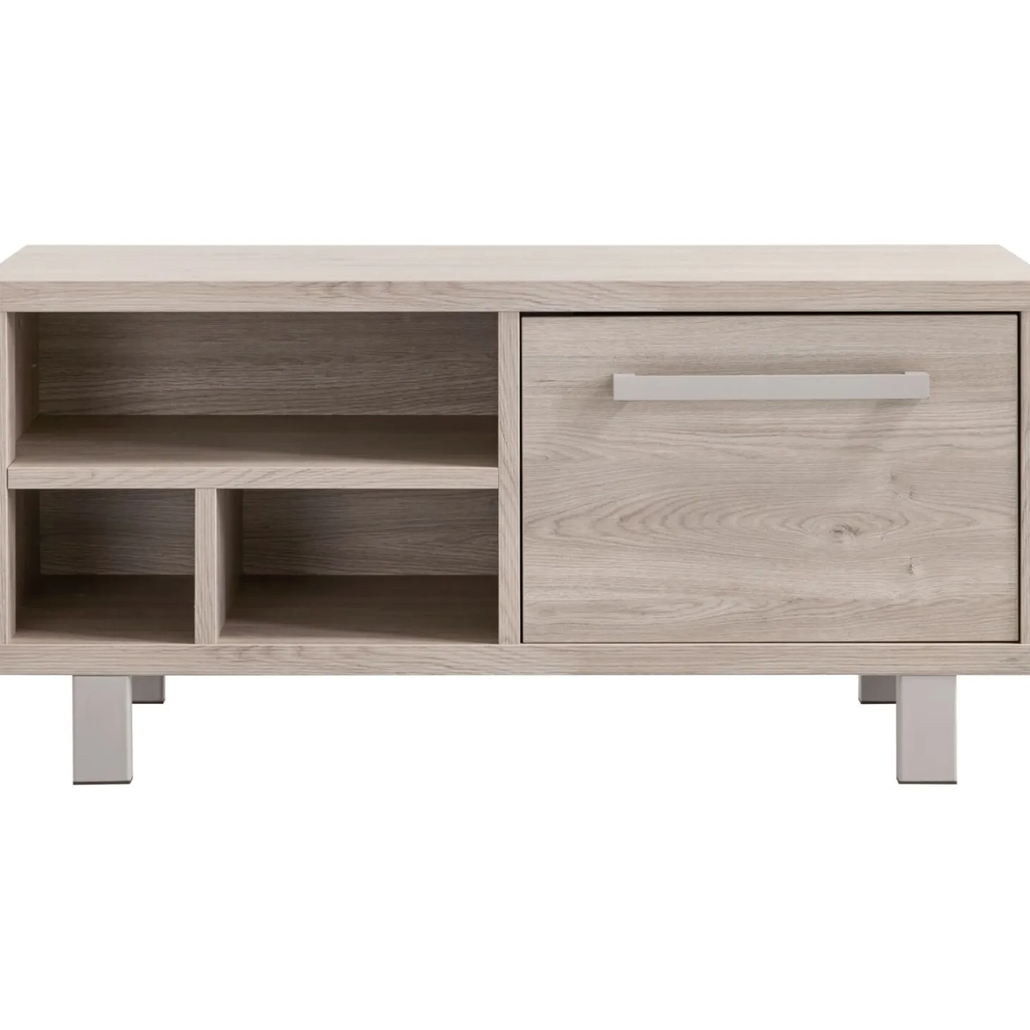 | Uitvoering | Uitgevoerd in de kleur grey oak met metalen handgrepen en poten in de kleur stone grey, met 1 deur en 3 open vakken. |