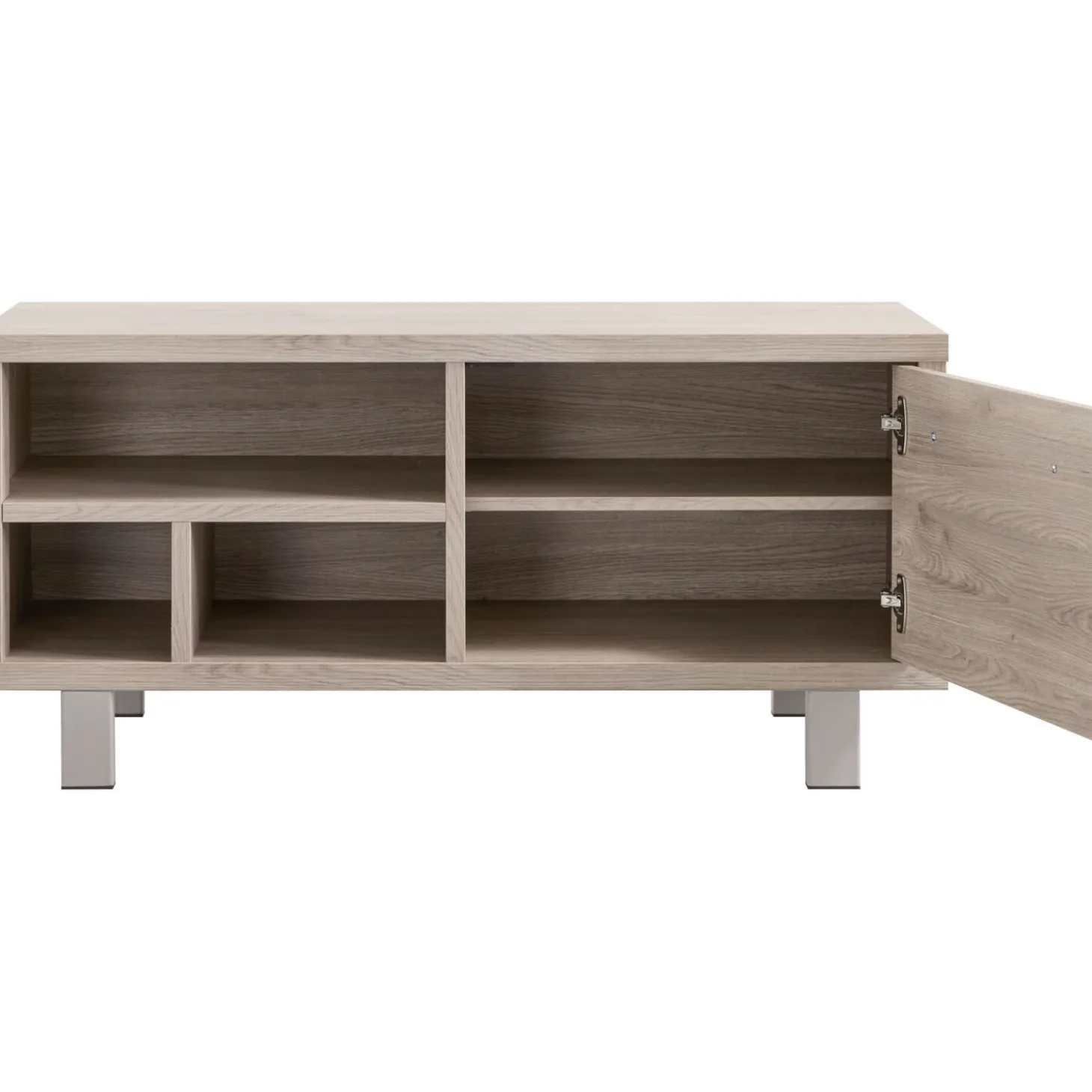 Modern TV-meubel met een strak uiterlijk. De mooie kleur grey oak en het gepoedercoate lichtgrijze metalen frame geven je interieur een unieke, zachte sfeer.