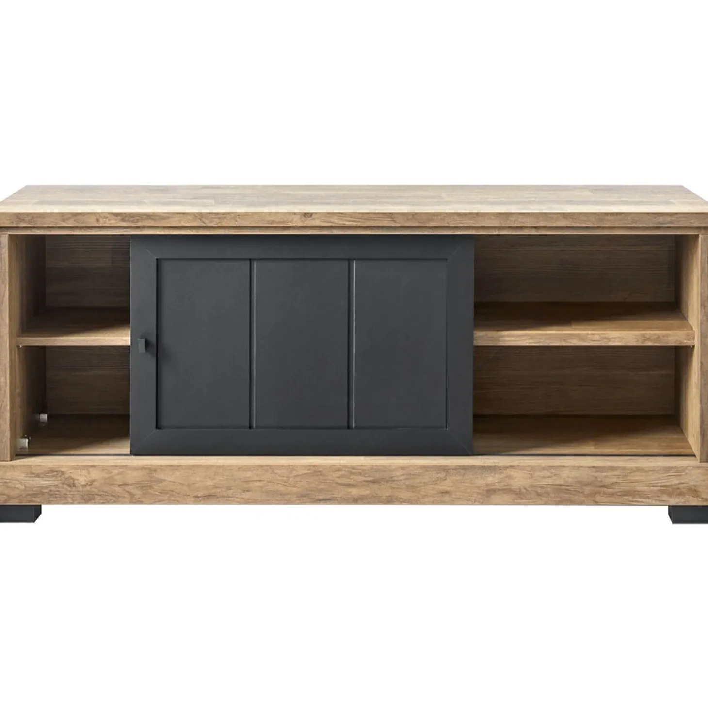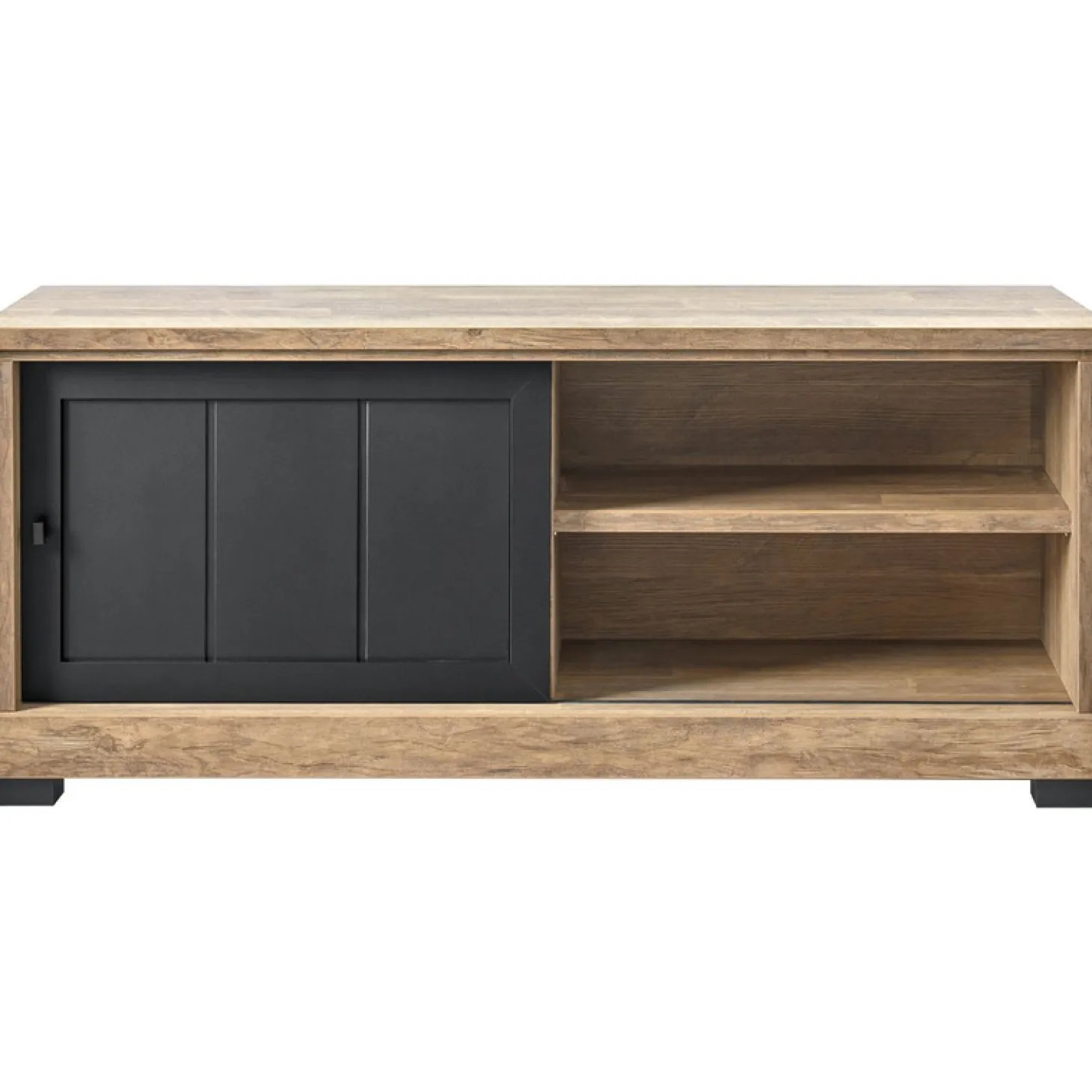 | Uitvoering | Uitgevoerd in de kleur old teak i.c.m. black met 1 schuifdeur en 2 open vakken. |