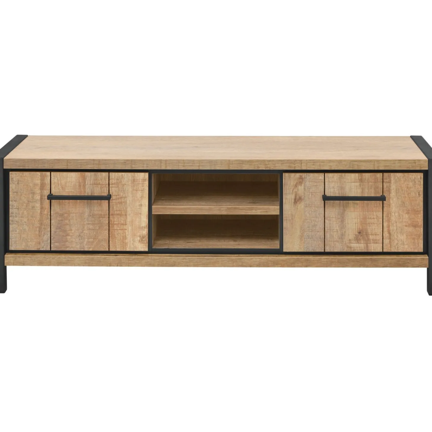| Uitvoering | Uitgevoerd in de kleur mango met zwart metalen frame, 2 deuren en 2 open vakken. |