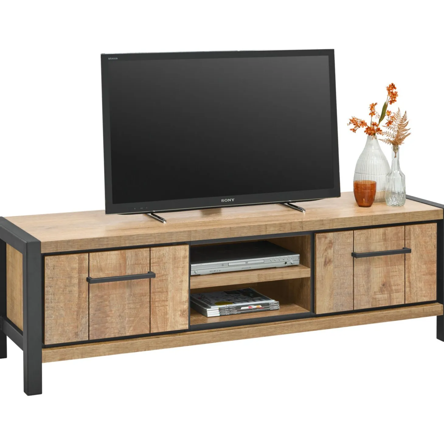 Dit TV-Meubel heeft een mooie uitstraling door de combinatie van zwart metaal met melamine in de kleur mango. Melamine lijkt op echt hout, het is makkelijk in onderhoud en erg krasbestendig. Een erg gebruiksvriendelijke kast dus!