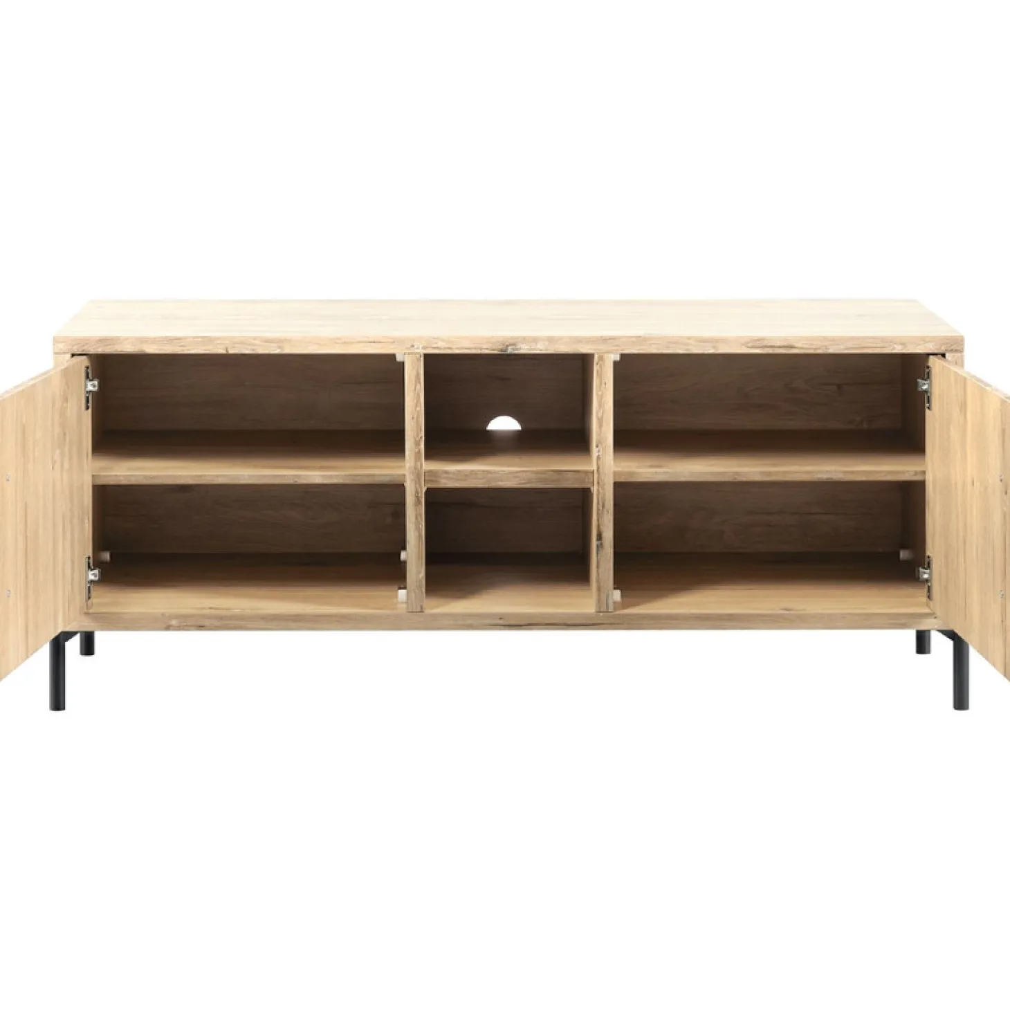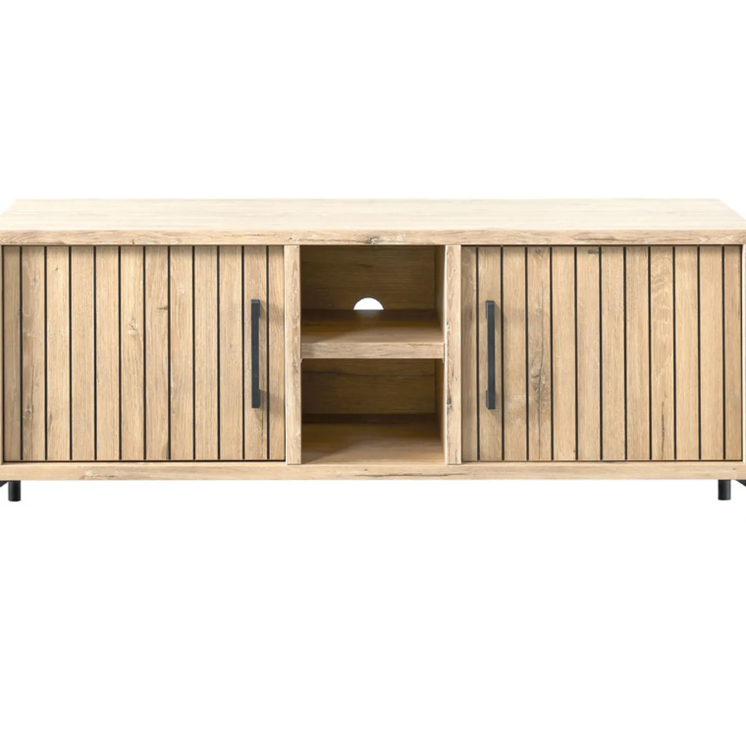 Met dit TV-meubel Mena haal je een echte eyecatcher in huis. De handgrepen en de poten zijn van mat zwart metaal, wat een mooi contrast geeft met de lichte houtkleur.