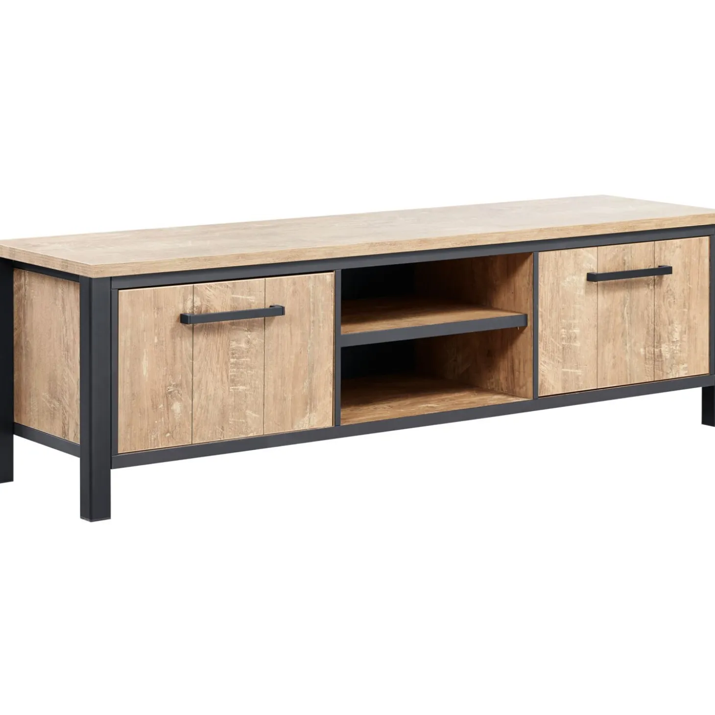 Dit tv-meubel Mendiga is een stoer industrieel tv-meubel met een metalen frame en een kras- slijt- en stootvaste melamine afwerking. Dankzij het slanke zwart metalen frame heeft tv-meubel Mendiga een stoere maar toch strakke look.