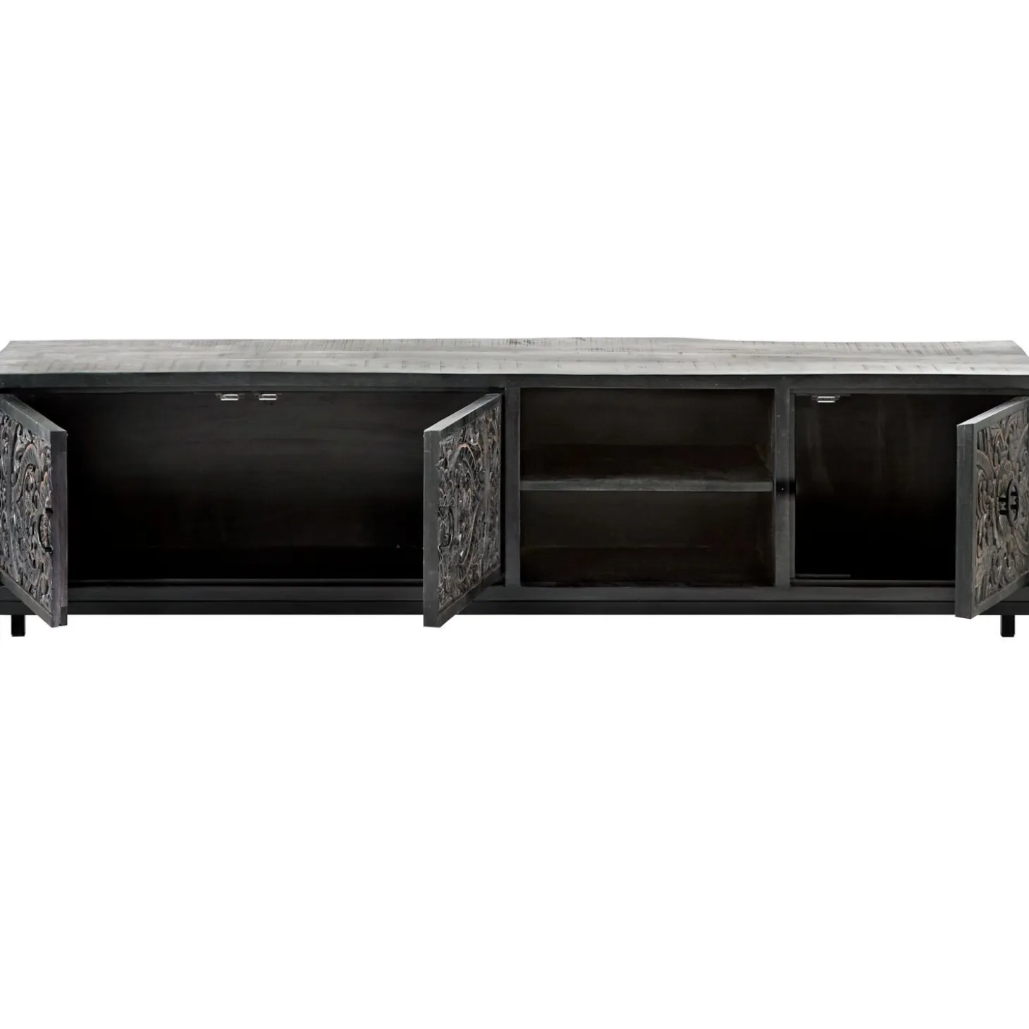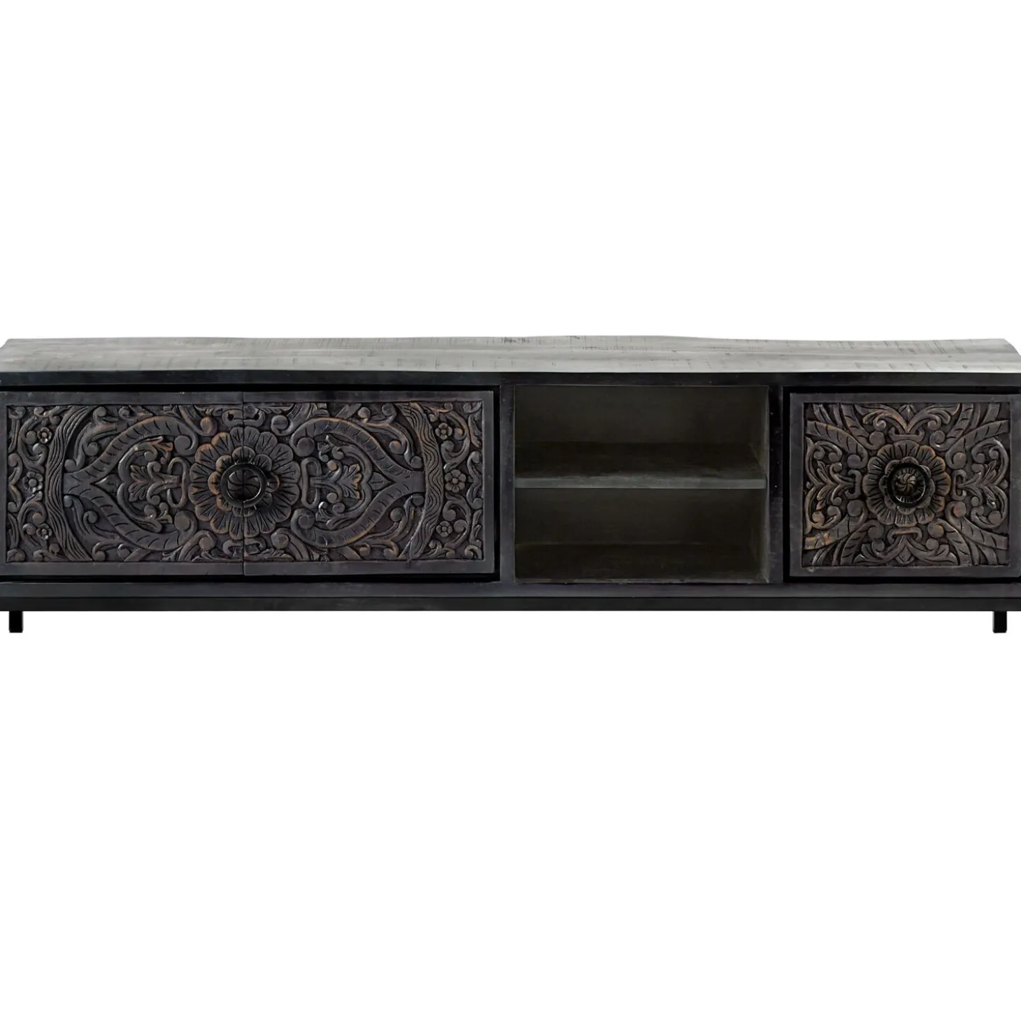 Zwart houten TV-meubel 190cm met houtsnijwerk