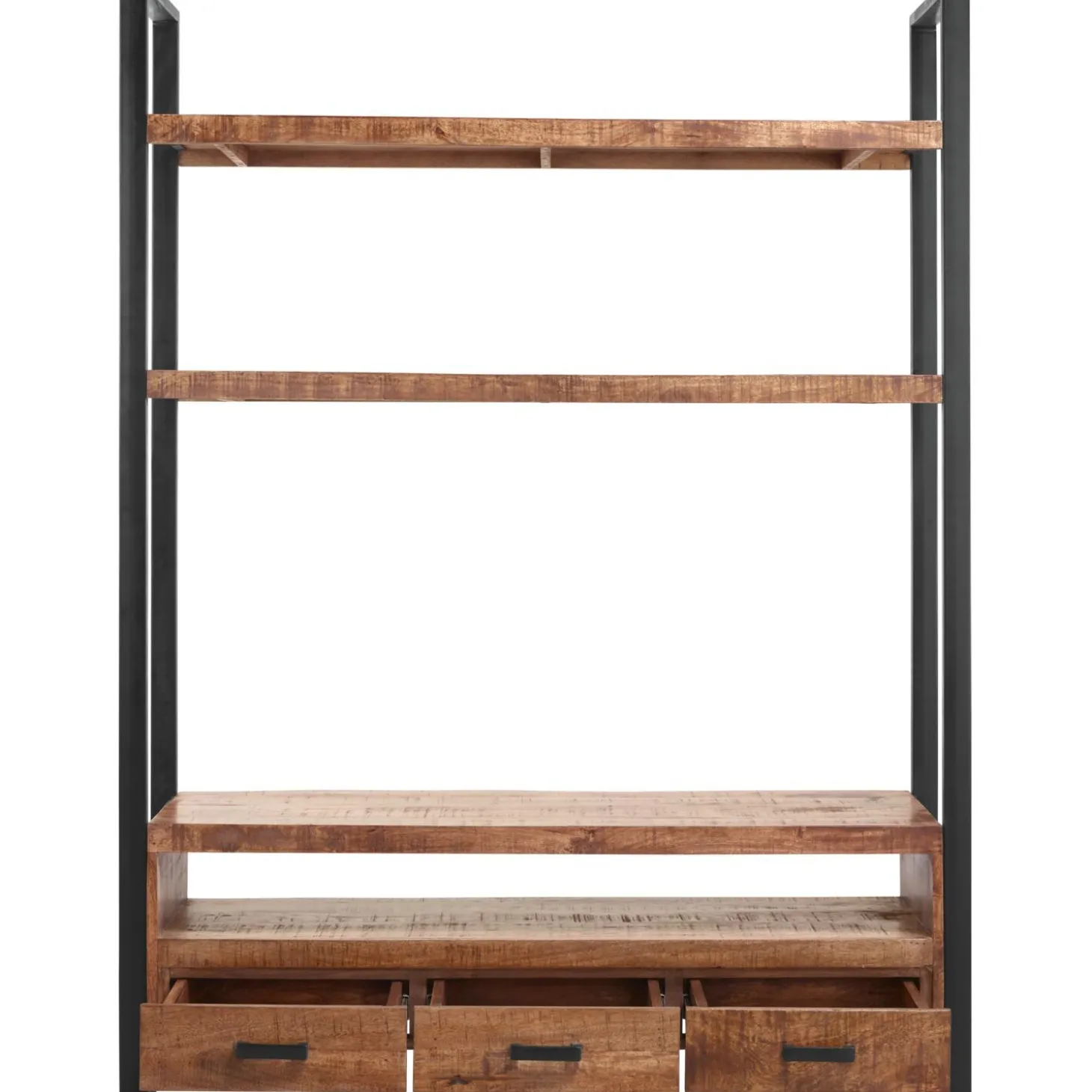 | Uitvoering | Uitgevoerd in mangohout in de kleur new weather barn met zwart metalen frame met 3 laden en 4 open vakken. |