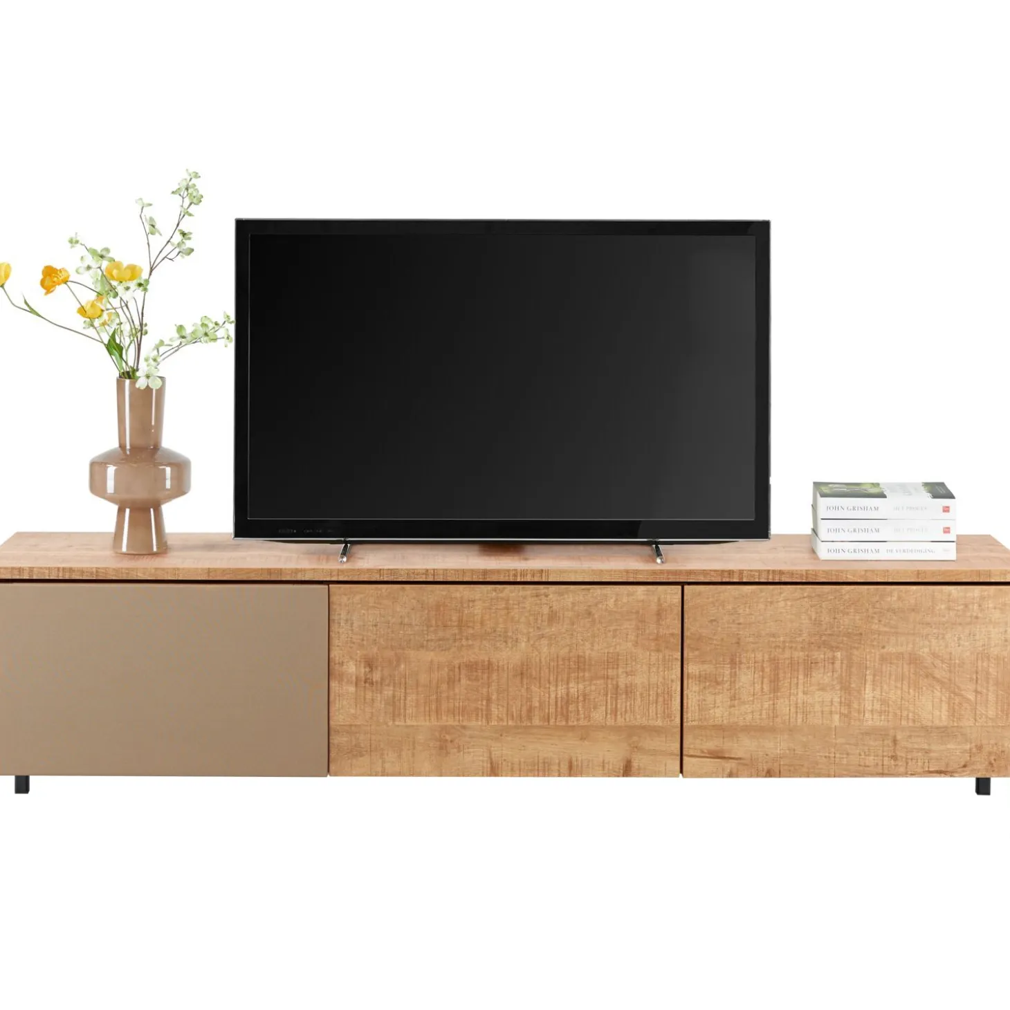 Dit TV-meubel is 181 cm breed en heeft 3 deuren, en is daardoor perfect voor een wat gemiddelde woonkamer. Er is ook een smallere variant (121 cm) met 2 deuren, en een bredere variant (241 cm) met 4 deuren. Optioneel kan het meubel ook zonder pootjes geleverd worden, je kunt het dan hangend monteren.