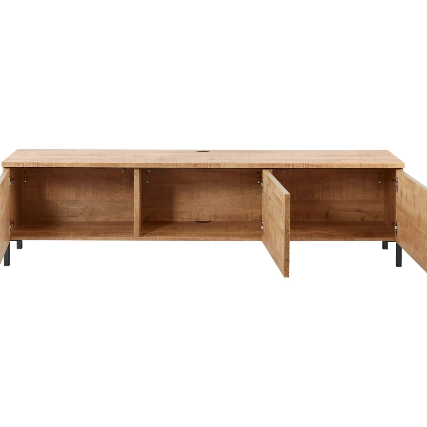 Dit TV-meubel heeft een moderne, elegante uitstraling door de het warme mango decor en de rechte, ranke vorm. Het biedt veel opbergmogelijkheden door de 3 deuren. Dankzij het softclose-mechanisme sluiten de deuren geruisloos. Je opent de greeploze deuren door te drukken op het deurtje. Het TV-meubel is aan de achterzijde voorzien van een opening voor het doorvoeren van de kabels. Deze uitvoering is voorzien van zwart metalen pootjes en wordt staand geplaatst. Het TV-meubel is voorzien van speakerdoek in 1 deur, in dezelfde kleur als het meubel. Je kunt je speaker, soudbar of andere apparatuur dus uit het zicht plaatsen, maar toch optimaal van het geluid genieten.