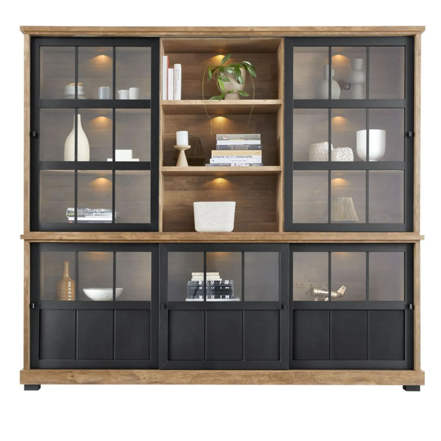 | Uitvoering | Uitgevoerd in de kleur old teak i.c.m. black met 2 glazen schuifdeuren, 3 kleine glazen schuifdeuren en 3 open vakken, incl. verlichting. |