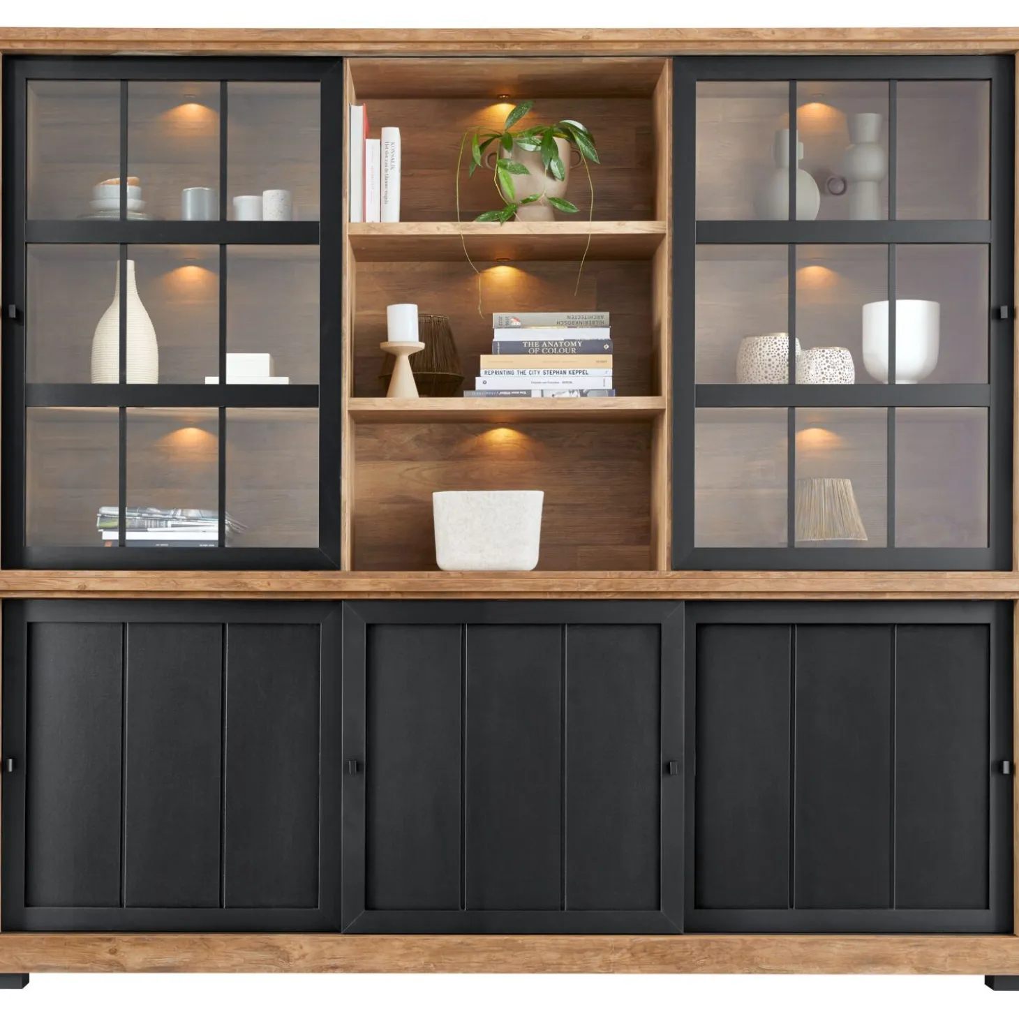 | Uitvoering | Uitgevoerd in de kleur old teak i.c.m. black met 2 glazen schuifdeuren, 3 dichte schuifdeuren en 3 open vakken, incl. verlichting. |