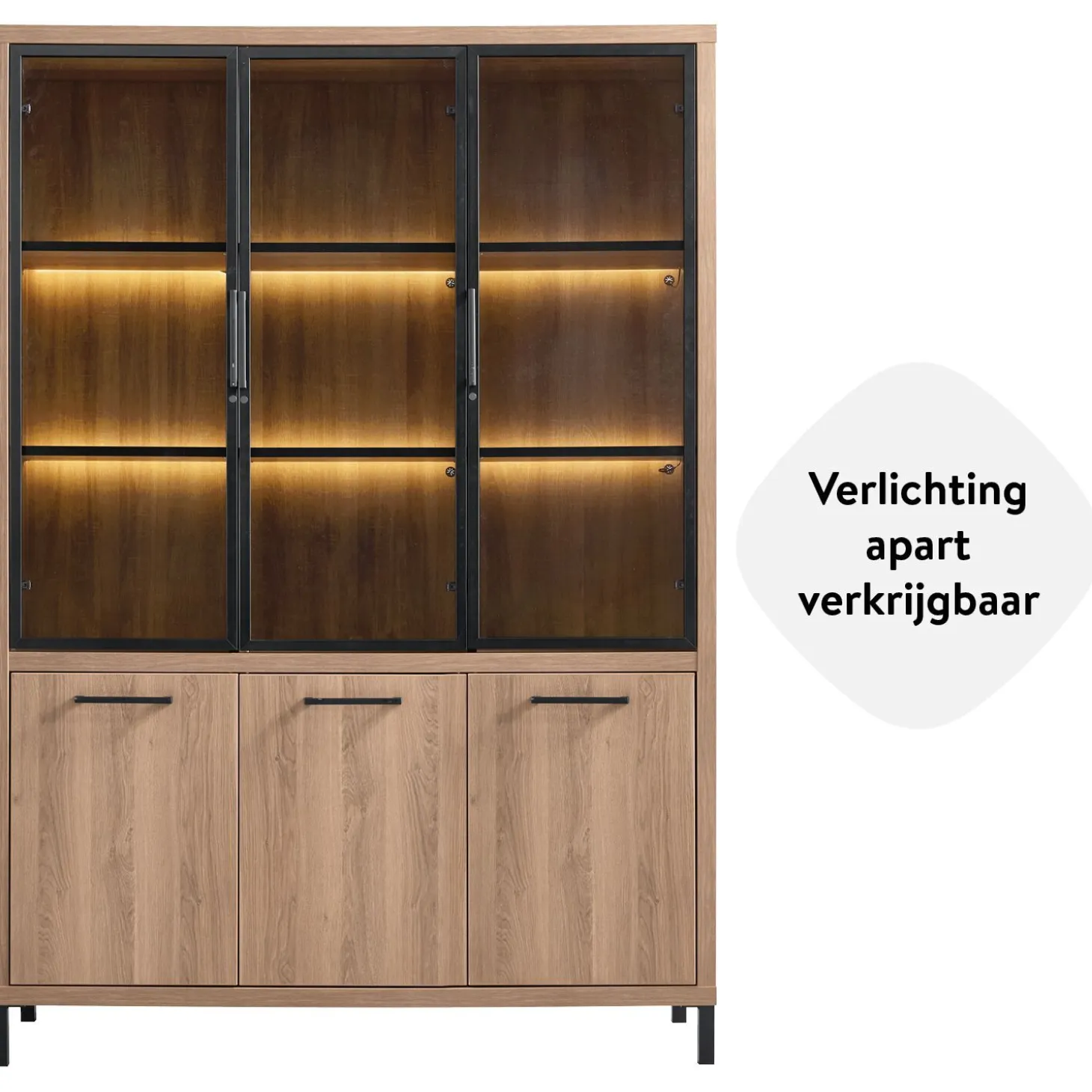 | Uitvoering | Uitgevoerd in melamine in de kleur brown cuneo oak met 3 deuren, 3 glasdeuren en zwart metalen poten. |