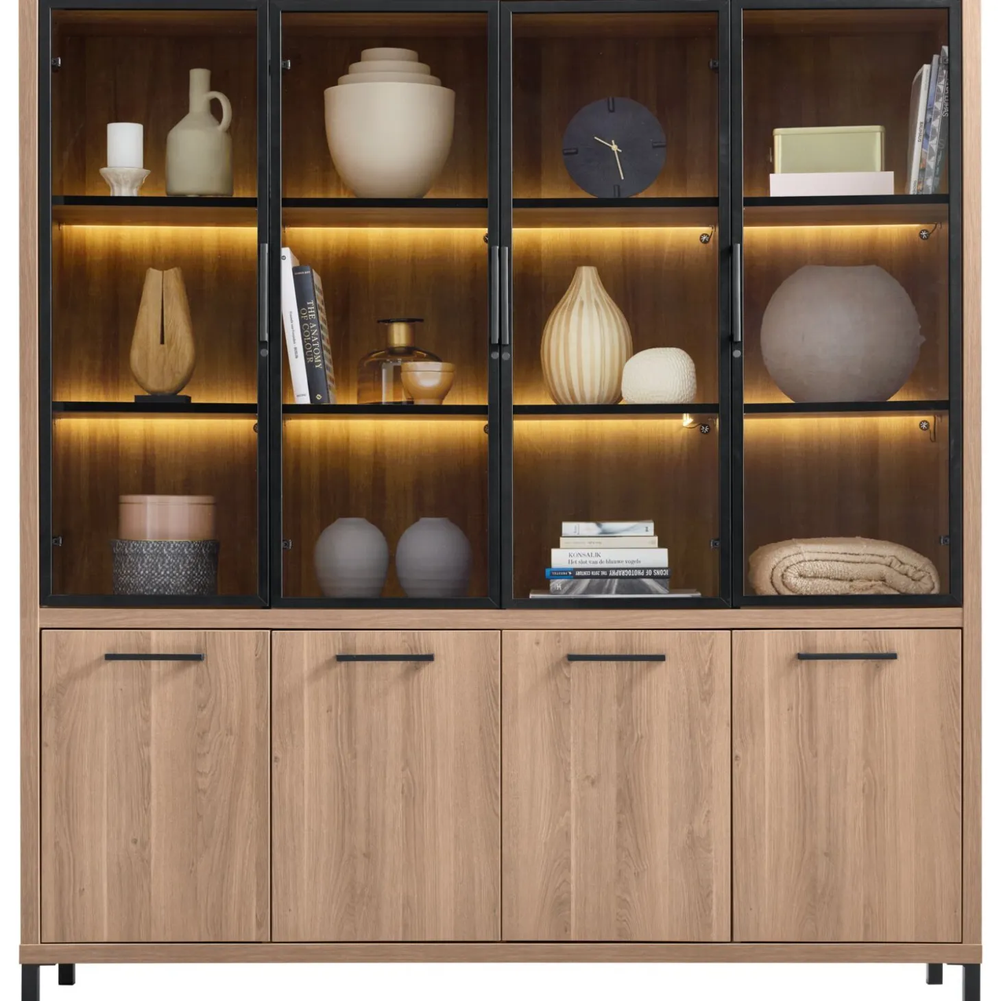 | Uitvoering | Uitgevoerd in melamine in de kleur brown cuneo oak met 4 deuren, 4 glasdeuren en zwart metalen poten. |