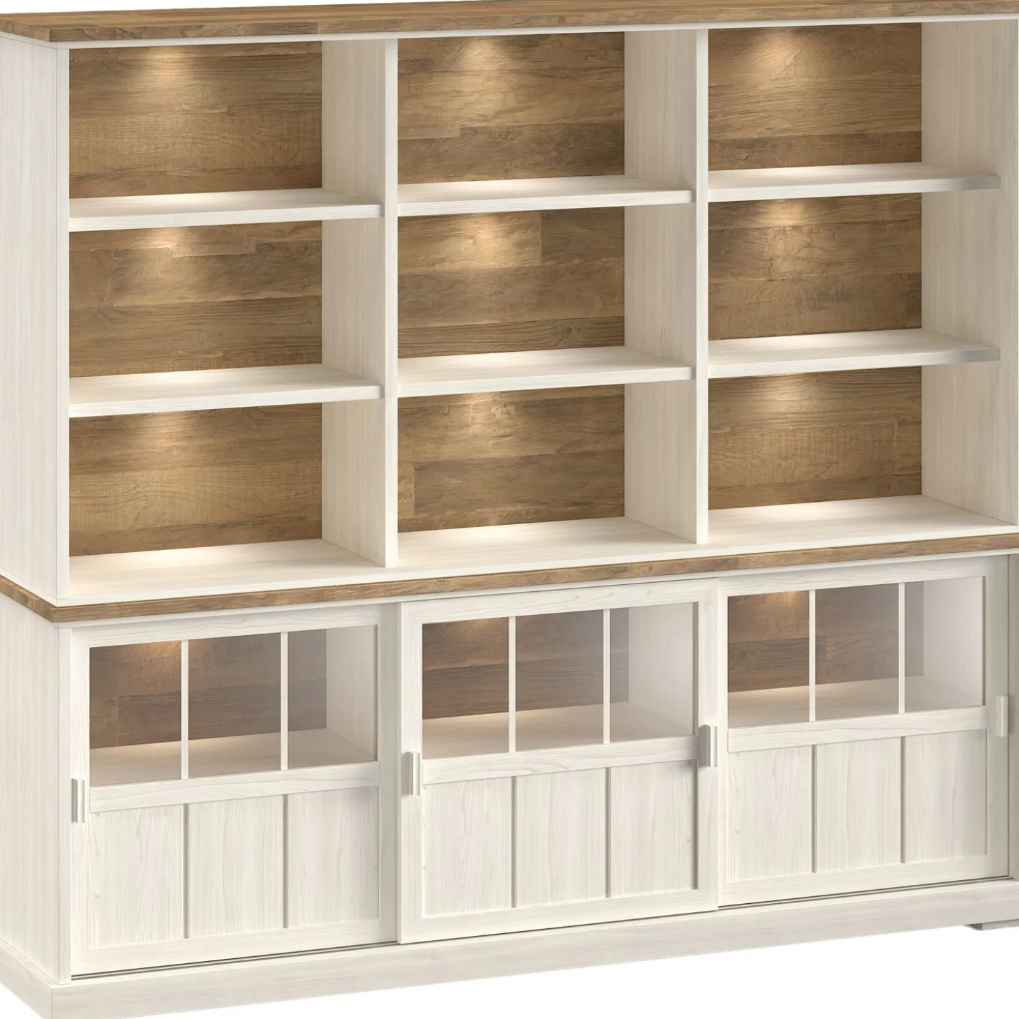 Verrijk je woonkamer met ons Eldora wandmeubel. Het gebruik van hoogwaardig melamine in een warme bruine tint in combinatie met tijdloos wit geeft dit meubelstuk niet alleen een warme uitstraling, maar verzekert ook duurzaamheid en onderhoudsgemak. Melamine heeft de uitstraling van echt hout, maar het is een zeer kras-, slijt-, en stootvast materiaal wat erg gebruiksvriendelijk en makkelijk te onderhouden is. Het verfijnde design van de kast wordt benadrukt door de 3 glazen schuifdeuren. Achter elke schuifdeur vind je 1 legplank; perfect om je bezittingen netjes georganiseerd te houden. De kast is voorzien van LED verlichting voor een sfeervol effect. De LED verlichting is voorzien van een stekker en wordt bediend met een voetschakelaar. De kast wordt ongemonteerd geleverd, maar is met behulp van een montagehandleiding eenvoudig in elkaar te zetten. Combineer deze kast met andere meubelen uit de serie Eldora en eet- en salontafels uit de series Silvares of Levado voor een compleet interieur.