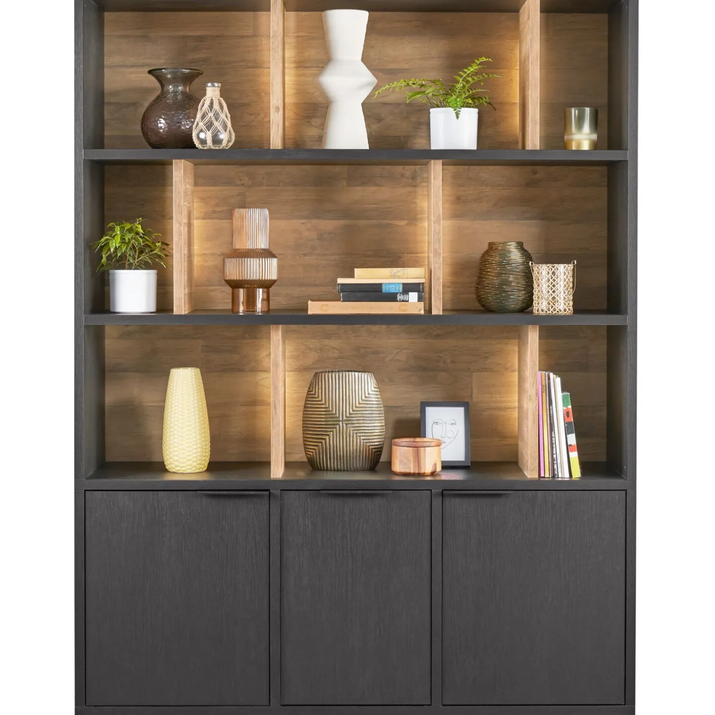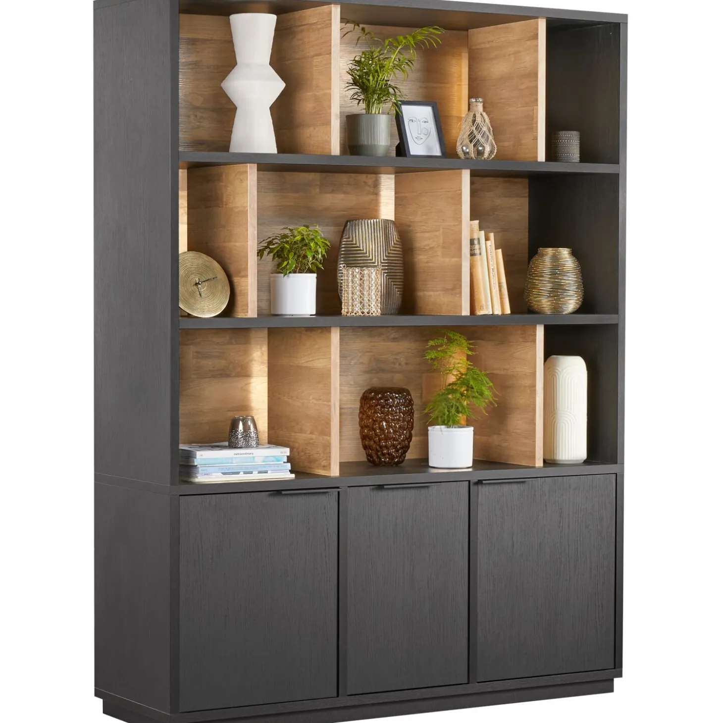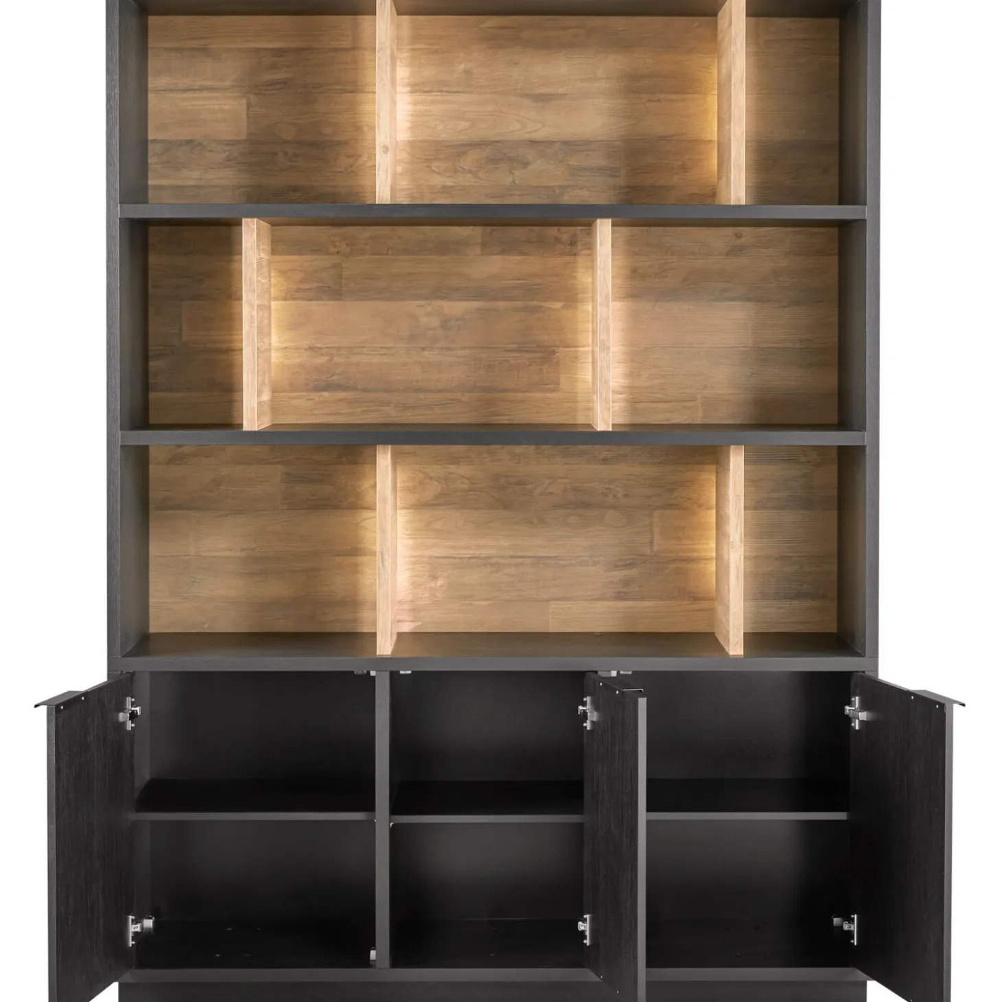 | Uitvoering | Uitgevoerd in de kleur elegant black i.c.m. old teak met 3 deuren en 9 open vakken, incl. verlichting. |