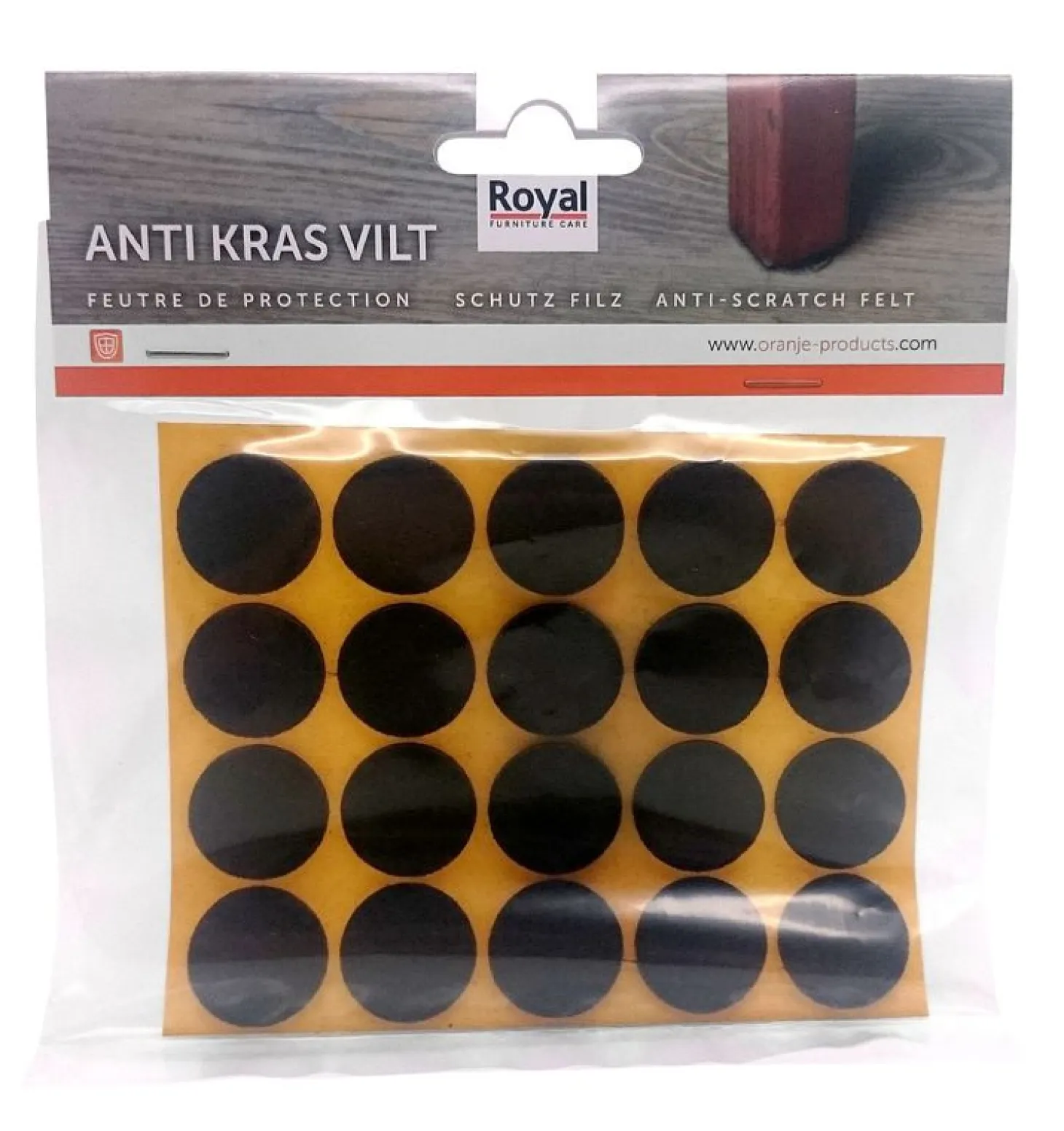 | Uitvoering | Zelfklevend anti-kras vilt met een diameter van 50mm, 8 stuks ( voor 2 stoelen) per zakje. |
